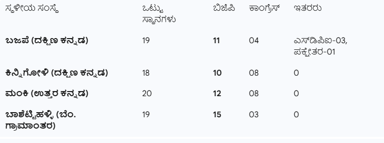 ದಕ್ಷಿಣ ಕನ್ನಡದ ಬಜಪೆ ಮತ್ತು ಕಿನ್ನಿಗೋಳಿ, ಉತ್ತರ ಕನ್ನಡದ ಮಂಕಿ ಹಾಗೂ ಬೆಂಗಳೂರು ಗ್ರಾಮಾಂತರದ ಬಾಶೆಟ್ಟಿಹಳ್ಳಿ ಪಟ್ಟಣ ಪಂಚಾಯಿತಿಗಳಲ್ಲಿ ಬಿಜೆಪಿ ಅಧಿಕಾರದ ಚುಕ್ಕಾಣಿ ಹಿಡಿಯುವಲ್ಲಿ ಯಶಸ್ವಿಯಾಗಿದೆ.