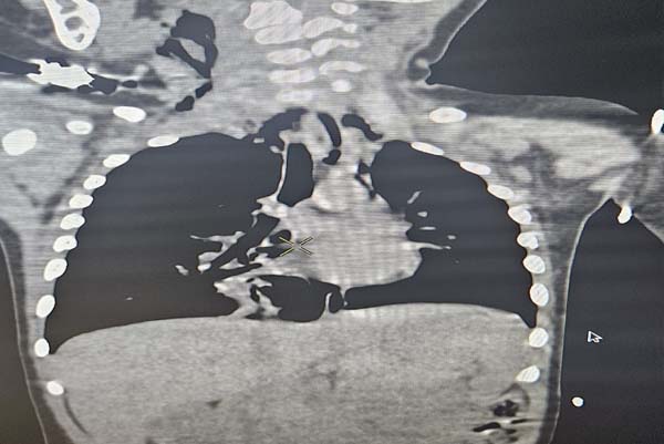 ಪೋಷಕರು ಸಾಮಾನ್ಯ ಶೀತ ಸಮಸ್ಯೆ ಎಂದು ತಿಳಿದು ಪುತ್ತೂರಿನ ಡಾ .ಶ್ರೀಕಾಂತ್ ರಾವ್ ಬಳಿ ತಪಾಸಣೆಗೆ ಕರೆದೊಯ್ದಿದ್ದಾರೆ. ಅಲ್ಲಿ ವೈದ್ಯರು ಎಕ್ಸ್ ರೇ ತಪಾಸಣೆಯಲ್ಲಿ ಮಗುವಿನ ಶ್ವಾಸನಾಳದಲ್ಲಿ ಯಾವುದೋ ವಸ್ತು ಸಿಲುಕಿರುವ ಶಂಕೆ ವ್ಯಕ್ತಪಡಿಸಿದ್ದಾರೆ. ತಕ್ಷಣ ಮಗುವನ್ನು ಕೆಎಂಸಿ ಆಸ್ಪತ್ರೆಗೆ ಕರೆತರಲಾಗಿದ್ದು ಡಾ. ಸ್ವಾತಿ ರಾವ್ ತಪಾಸಣೆಯಲ್ಲಿ ಮಗುವಿನ ಸ್ಥಿತಿ ಗಂಭೀರವಾಗಿರುವುದನ್ನು ಪತ್ತೆಹಚ್ಚಿದ್ದಾರೆ. ಅದಾಗಲೇ ಮಗುವಿನ ಆಕ್ಸಿಜನ್ ಸ್ಯಾಚುರೇಶನ್ 88 ಕ್ಕೆ ಕುಸಿದಿತ್ತು. ಸಿಟಿ ಸ್ಕ್ಯಾನ್ನಲ್ಲಿ ಮಗುವಿನ ಬಲ ಶ್ವಾಸನಾಳದಲ್ಲಿ ಚಿಕ್ಕದೊಂದು ವಸ್ತು ಸಿಲುಕಿರುವುದು ಪತ್ತೆಯಾಗಿದೆ.