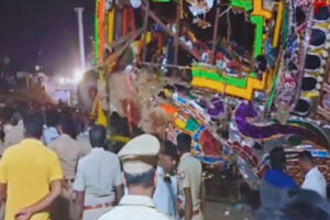 ಧಿಡೀರನೆ ಕುಸಿದು ಬಿತ್ತು 60 ಅಡಿ ಎತ್ತರದ ರಥ: ದಿಕ್ಕಾಪಾಲಾಗಿ ಓಡಿದ ಜನ, ಹಲವರಿಗೆ ಗಾಯ