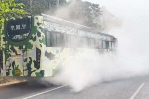 ಖಾಸಗಿ ಬಸ್ಸಿನಲ್ಲಿ ಆಕಸ್ಮಿಕ ಬೆಂಕಿ: ಪ್ರಯಾಣಿಕರು ಪವಾಡ ಸದೃಶ ಪಾರು