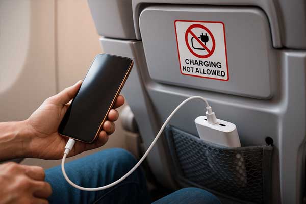 ಸುರಕ್ಷತೆಯ ದೃಷ್ಟಿಯಿಂದ ವಿಮಾನದಲ್ಲಿ ಪ್ರಯಾಣಿಸುವಾಗ ಫೋನ್ ಅಥವಾ ಇತರ ಗ್ಯಾಜೆಟ್ಗಳನ್ನು ಆಸನದ ಪವರ್ ಔಟ್ಗಳ ಮೂಲಕ ಚಾರ್ಜ್ ಮಾಡುವಂತಿಲ್ಲ.