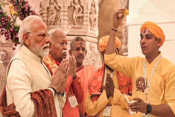ಧ್ವಜಾರೋಹಣ ಸಮಯದಲ್ಲಿ ಪ್ರಧಾನಿ ಮೋದಿ ಅವರೊಂದಿಗೆ ಆರ್‌ಎಸ್‌ಎಸ್ ಮುಖ್ಯಸ್ಥ ಮೋಹನ್ ಭಾಗವತ್, ಉತ್ತರ ಪ್ರದೇಶ ರಾಜ್ಯಪಾಲೆ ಆನಂದಿಬೆನ್ ಪಟೇಲ್ ಮತ್ತು ಮುಖ್ಯಮಂತ್ರಿ ಯೋಗಿ ಆದಿತ್ಯನಾಥ್ ಸಾಥ್ ನೀಡಿದ್ದಾರೆ.