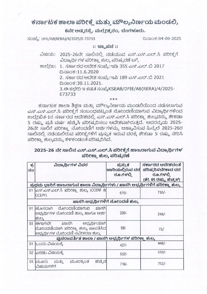 2025-26ನೇ ಸಾಲಿನ ಪರೀಕ್ಷಾ ಶುಲ್ಕವನ್ನು 5% ಏರಿಕೆ ಮಾಡಿ ಕರ್ನಾಟಕ ಶಾಲಾ ಪರೀಕ್ಷಾ ಮತ್ತು ಮೌಲ್ಯ ನಿರ್ಣಯ ಮಂಡಳಿಯಿಂದ ಆದೇಶ ಹೊರಡಿಸಿದೆ.