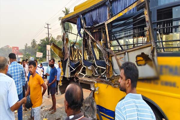 ಗೋವಾದಿಂದ ಕೇರಳಕ್ಕೆ ಮೀನು ಸಾಗಿಸುತ್ತಿದ್ದ ಕ್ಯಾಂಟರ್‌ ಚಾಲಕ ಸಂಜೀವ ನಿದ್ದೆ ಮಂಪರಿನಲ್ಲಿ ಗಾಡಿ ಓಡಿಸಿದ್ದೇ ಅಪಘಾತಕ್ಕೆ ಕಾರಣವಾಗಿದೆ. ಘಟನೆಯಿಂದ ಬಸ್ಸಿನೊಳಗಿದ್ದ ಹೈಸ್ಕೂಲ್ನ ನಾಲ್ಕು ವಿದ್ಯಾರ್ಥಿಗಳು ಹಾಗೂ ಮೂರು ವಿದ್ಯಾರ್ಥಿನಿಯರು ಗಾಯಗೊಂಡಿದ್ದಾರೆ.