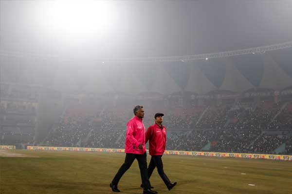 ಭಾರೀ ಮುಸುಕು ಹಾಗೂ ದಟ್ಟ ಮಂಜು ಮೈದಾನದ ತುಂಬಾ ಹರಡಿದ್ದರಿಂದ ಅಂಪೈರ್​ಗಳು ಪಂದ್ಯವನ್ನು ರದ್ದುಗೊಳಿಸಲು ನಿರ್ಧರಿಸಿದ್ದಾರೆ. ಹೀಗಾಗಿ ಈ ಪಂದ್ಯ ಟಾಸ್ ಕೂಡ ನಡೆಯದೆ ರದ್ದಾಗಿದೆ.
