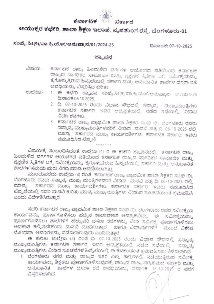 - ಬೆಂಗಳೂರು ನಗರ ಮತ್ತು ರಾಜ್ಯದ ಇತರ ಎಲ್ಲ ಜಿಲ್ಲೆಗಳಲ್ಲಿ ನಡೆಯುತ್ತಿರುವ ಸಮೀಕ್ಷೆ ಕಾರ್ಯವನ್ನು ಶಿಕ್ಷಕರು ಪೂರ್ಣಗೊಳಿಸುವುದಕ್ಕೆ ರಾಜ್ಯದ ರಾಜ್ಯ ಪಠ್ಯಕ್ರಮದ ಸರ್ಕಾರಿ ಮತ್ತು ಅನುದಾನಿತ ಶಾಲೆಗಳ ದಸರಾ ರಜೆ ಅವಧಿಯನ್ನು ದಿನಾಂಕ: 18-10-2025 ರ ವರೆಗೆ ವಿಸ್ತರಿಸಲಾಗಿದೆ.
