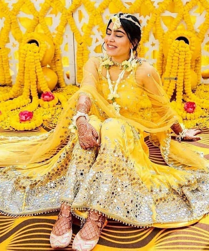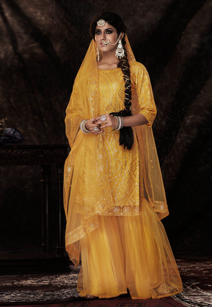 ಹಳದಿ ಅಥವಾ ಮಸ್ಟರ್ಡ್ ಶೇಡ್ನ ಶರಾರಾ ಸೆಟ್ ಅರಿಶಿಣಕ್ಕೆ ಪರ್ಫೆಕ್ಟ್. ಹಗುರವಾದ ಫ್ಯಾಬ್ರಿಕ್, ಮಿರರ್ ವರ್ಕ್ ಅಥವಾ ಫ್ಲೋರಲ್ ಡಿಸೈನ್ ಇದ್ದರೆ ಫೋಟೋಗಳಲ್ಲಿ ಇನ್ನೂ ಸುಂದರವಾಗಿ ಕಾಣುತ್ತದೆ.