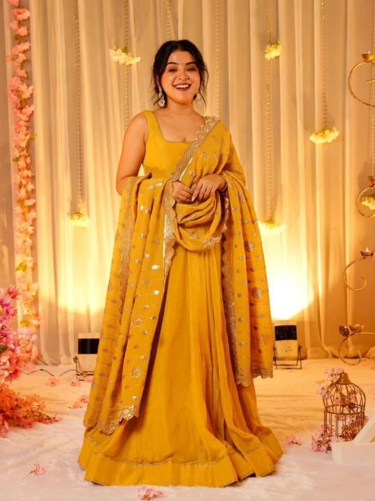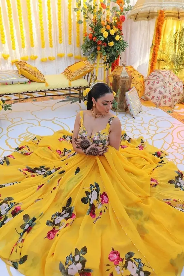 ಸ್ವಲ್ಪ ಗ್ರ್ಯಾಂಡ್ ಆಗಿ ಕಾಣಬೇಕು ಅಂದ್ರೆ ಯೆಲ್ಲೋ ಲೆಹೆಂಗಾ ಬೆಸ್ಟ್ ಆಯ್ಕೆ. ಫ್ಲೋರಲ್ ದುಪಟ್ಟಾ ಅಥವಾ ಗೋಟಾ ವರ್ಕ್ ಇದ್ದರೆ ಲುಕ್ ಇನ್ನೂ ಕ್ಲಾಸಿ ಆಗುತ್ತದೆ.