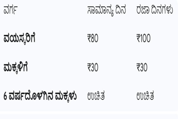 ಸಾರ್ವಜನಿಕರ ಅನುಕೂಲಕ್ಕಾಗಿ ಇಲಾಖೆಯು ಈ ಕೆಳಗಿನಂತೆ ಟಿಕೆಟ್ ದರ ನಿಗದಿಪಡಿಸಿದೆ: