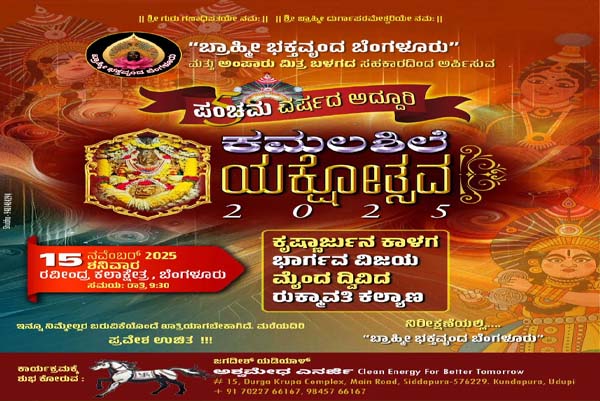 ಈಗಾಗಲೇ ಅಧಿಕೃತ ಲಾಂಛನವನ್ನು ಕ್ಷೇತ್ರದಲ್ಲಿ ಅನಾವರಣಗೊಳಿಸಿ 5ನೇ ವರ್ಷದ ಅದ್ದೂರಿ ಕಮಲಶಿಲೆ ಯಕ್ಷೋತ್ಸವಕ್ಕೆ ಅಂಬೆಗಾಲಿಡುತ್ತಿರುವ ಬ್ರಾಹ್ಮೀ ಭಕ್ತವೃಂದ ಇದೇ ನವೆಂಬರ್ 15, 2025 ಶನಿವಾರ ರಾತ್ರಿ 9:30ಕ್ಕೆ