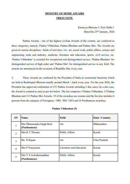 ದೇಶದ ಪ್ರತಿಷ್ಠಿತ ಹಾಗೂ ಅತ್ಯುನ್ನತ ಪ್ರಶಸ್ತಿಗಳಾದ 2025ರ ಸಾಲಿನ ಸಾಧಕರಿಗೆ ಪದ್ಮಭೂಷಣ, ಪದ್ಮ ವಿಭೂಷಣ ಹಾಗೂ ಪದ್ಮಶ್ರೀ ಪ್ರಶಸ್ತಿ ಪ್ರಕಟಗೊಂಡಿದೆ.