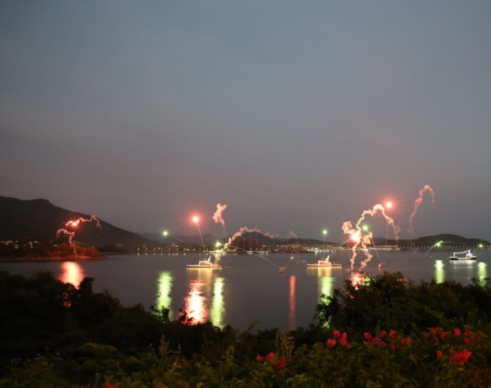 ಸಂಜೆ ಸೂರ್ಯಾಸ್ತದ ಸಮಯದಲ್ಲಿ ಭಾರತೀಯ ನೌಕಾ ಯುದ್ಧನೌಕೆಗಳು ಮಾಡಿದ ಚಿತ್ತಾಕರ್ಷಕ ಪ್ರದರ್ಶನವು ನೆರೆದಿದ್ದ ಗಣ್ಯರು ಮತ್ತು ಸಾರ್ವಜನಿಕರನ್ನು ಮಂತ್ರಮುಗ್ಧಗೊಳಿಸಿತು. ಯುದ್ಧನೌಕೆಗಳು ಜಲರಾಶಿಯ ಮೇಲೆ ತಮ್ಮ ಭವ್ಯತೆಯನ್ನು ಅನಾವರಣಗೊಳಿಸಿದವು.