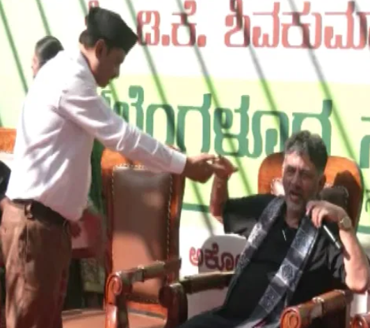 ಘಟನೆ ನಡೆದಿದ್ದು ಹೀಗೆ: ಡಿಕೆಶಿ ಅವರು ಪಾರ್ಕ್ನಲ್ಲಿ ವಾಕ್ ಮಾಡುತ್ತಾ ಆಗಮಿಸಿದರು. ಆಗ ಆರ್ಎಸ್ಎಸ್ ಪಥಸಂಚಲನ ಮುಗಿಸಿದ್ದ ಶಾಸಕ ಮುನಿರತ್ನ ಅವರು ಆರ್ಎಸ್ಎಸ್ ಸಮವಸ್ತ್ರದಲ್ಲೇ ಜನರ ಮಧ್ಯೆ ಕುಳಿತಿದ್ದರು. ಮುನಿರತ್ನರನ್ನು ನೋಡಿದ ಡಿಕೆಶಿ ಅವರು ತಮಾಷೆಯ ಧ್ವನಿಯಲ್ಲಿ, “ಕರಿ ಟೋಪಿ ಎಂಎಲ್ಎ ಬಾರಪ್ಪ” ಎಂದು ವೇದಿಕೆಗೆ ಆಹ್ವಾನಿಸಿದರು.