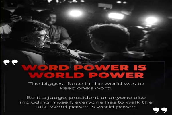 ಕೊಟ್ಟ ಮಾತು ಉಳಿಸಿಕೊಳ್ಳುವುದೇ ವಿಶ್ವದಲ್ಲಿರುವ ದೊಡ್ಡ ಶಕ್ತಿ ಎಂದು ಡಿಕೆ ಶಿವಕುಮಾರ್ ಬರೆದುಕೊಂಡಿದ್ದಾರೆ. ವರ್ಡ್ ಪವರ್ ಈಸ್ ವರ್ಲ್ಡ್ ಪವರ್. ಅದು ನ್ಯಾಯಾಧೀಶರಾಗಿರಲಿ, ಅಧ್ಯಕ್ಷರಾಗಿರಲಿ ಅಥವಾ ನಾನೂ ಸೇರಿದಂತೆ ಯಾರೇ ಆಗಿರಲಿ, ಆಡಿದ ಮಾತಿನಂತೆ ನಡೆದುಕೊಳ್ಳಬೇಕು ಎಂದು ಅವರು ಎಕ್ಸ್ ಸಂದೇಶದಲ್ಲಿ ಉಲ್ಲೇಖಿಸಿದ್ದಾರೆ.