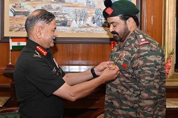 ದಾದಾಸಾಹೇಬ್ ಫಾಲ್ಕೆ ಪ್ರಶಸ್ತಿಗೆ ಭಾಜನರಾದ ಮಲಯಾಳಂ ಸೂಪರ್ಸ್ಟಾರ್ ಮೋಹನ್ ಲಾಲ್ ಅವರಿಗೆ ಭಾರತೀಯ ಸೇನಾ ಮುಖ್ಯಸ್ಥ ಜನರಲ್ ಉಪೇಂದ್ರ ದ್ವಿವೇದಿ ಅವರು ಮಂಗಳವಾರ ಕಮಾಂಡೇಷನ್ ಪ್ರಶಂಸಾ ಪದಕ ನೀಡಿ ಗೌರವಿಸಿದರು.