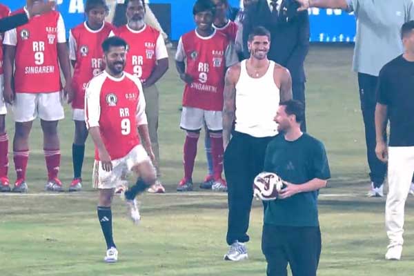 ಕೊಲ್ಕತ್ತಾ ಭೇಟಿ ಬಳಿಕ ಲಿಯೋನಲ್ ಮೆಸ್ಸಿ ಅವರು ಸಂಜೆ ಸಂಜೆ 4:30ರ ಸುಮಾರಿಗೆ ಶಂಷಾಬಾದ್ ವಿಮಾನ ನಿಲ್ದಾಣದಲ್ಲಿ ಬಂದಿಳಿದು ನೇರವಾಗಿ ತಾಜ್ ಫಲಕ್ನುಮಾ ಪ್ಯಾಲೆಸ್ ತಲುಪಿದ್ರು. ಅಲ್ಲಿ, ಮೆಸ್ಸಿ ಅವರನ್ನ ತೆಲಂಗಾಣ ಸಿಎಂ ರೇವಂತ್ ರೆಡ್ಡಿ ಅವರು ಸ್ವಾಗತಿಸಿದ್ರು. ನಂತರ, ಮೆಸ್ಸಿ ಉಪ್ಪಲ್ ಸ್ಟೇಡಿಯಂನಲ್ಲಿ ಆಯೋಜಿಸಿದ್ದ ಕಾರ್ಯಕ್ರಮದಲ್ಲಿ ಪಾಲ್ಗೊಂಡು ಸಿಎಂ ರೇವಂತ್ ರೆಡ್ಡಿ ಅವರೊಂದಿಗೆ ಫುಟ್ಬಾಲ್ ಆಡಿದರು.