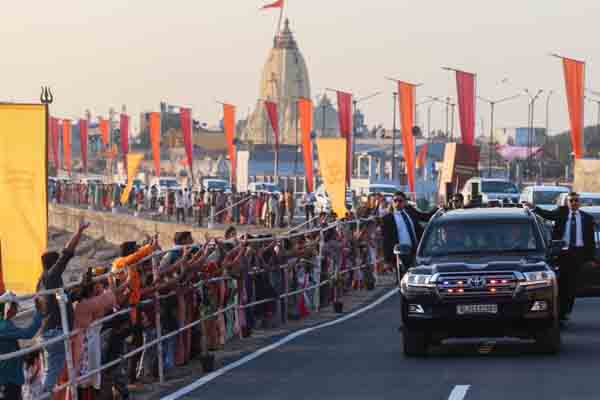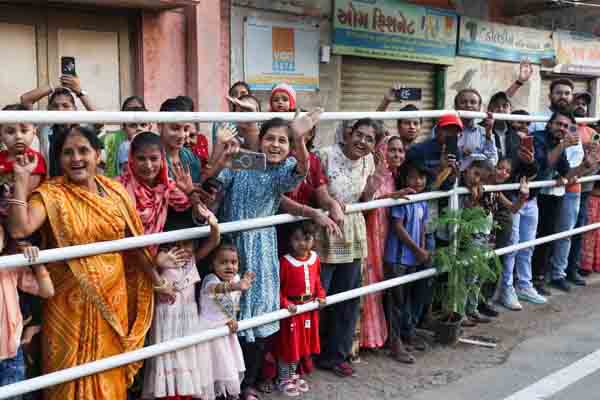 ಈ ವೇಳೆ ದಾರಿಯುದ್ದಕ್ಕೂ ಸಾರ್ವಜನಿಕರು ಕೇಸರಿ ಬಾವುಟಗಳನ್ನು ಹಿಡಿದು, “ಮೋದಿ, ಮೋದಿ” ಎಂದು ಘೋಷಣೆ ಕೂಗುತ್ತಾ ಅದ್ದೂರಿಯಾಗಿ ಸ್ವಾಗತ ಕೋರಿದರು.