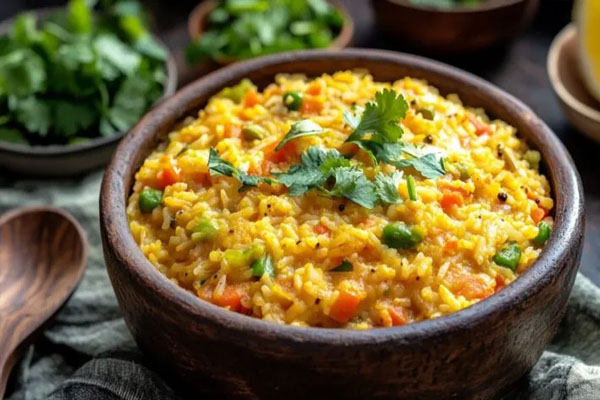 ಈಗ ನೀರು ಹಾಕಿ ನೆನೆಸಿದ ಅಕ್ಕಿ-ಬೇಳೆ ಸೇರಿಸಿ ಕುಕ್ಕರ್ ಮುಚ್ಚಿ 3–4 ವಿಸಿಲ್ ಬೇಯಿಸಿ. ಪ್ರೆಶರ್ ಇಳಿದ ನಂತರ ಕೊತ್ತಂಬರಿ ಸೊಪ್ಪು ಹಾಕಿ ಮಿಕ್ಸ್ ಮಾಡಿ. ಬಿಸಿ ಬಿಸಿ ತರಕಾರಿ ರೈಸ್ ಕಿಚಡಿಯನ್ನು ತುಪ್ಪ ಅಥವಾ ಮೊಸರಿನ ಜೊತೆಗೆ ಸರ್ವ್ ಮಾಡಿ.