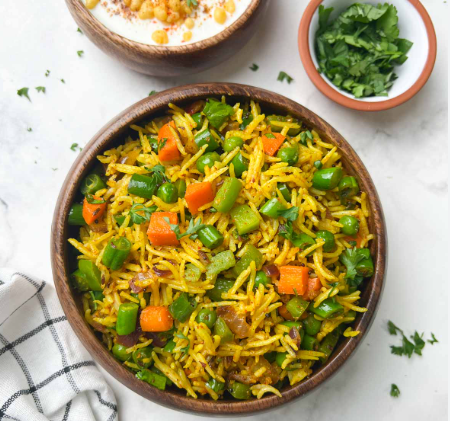 ಅಕ್ಕಿಯನ್ನು ಚೆನ್ನಾಗಿ ತೊಳೆದು, 15-20 ನಿಮಿಷಗಳ ಕಾಲ ನೆನೆಸಿಡಿ. ನಂತರ ನೀರನ್ನು ಬಸಿದು ಇಟ್ಟುಕೊಳ್ಳಿ. ದಪ್ಪ ತಳದ ಪಾತ್ರೆ ಅಥವಾ ಪ್ರೆಶರ್ ಕುಕ್ಕರ್‌ನಲ್ಲಿ ಎಣ್ಣೆ ಅಥವಾ ತುಪ್ಪ ಹಾಕಿ ಬಿಸಿ ಮಾಡಿ. ಸಾಸಿವೆ ಮತ್ತು ಜೀರಿಗೆ ಹಾಕಿ, ಸಿಡಿಯಲು ಬಿಡಿ. ಕರಿಬೇವು ಮತ್ತು ಹಸಿ ಮೆಣಸಿನಕಾಯಿ ಸೇರಿಸಿ. ನಂತರ ಹೆಚ್ಚಿದ ಈರುಳ್ಳಿ ಹಾಕಿ, ತಿಳಿ ಗೋಲ್ಡನ್ ಬಣ್ಣ ಬರುವವರೆಗೆ ಹುರಿಯಿರಿ. ಶುಂಠಿ-ಬೆಳ್ಳುಳ್ಳಿ ಪೇಸ್ಟ್ ಸೇರಿಸಿ, ಅದರ ಹಸಿ ವಾಸನೆ ಹೋಗುವವರೆಗೆ ಹುರಿಯಿರಿ. ನಂತರ ಹೆಚ್ಚಿದ ಟೊಮೆಟೊ ಸೇರಿಸಿ, ಮೆತ್ತಗಾಗುವವರೆಗೆ ಬೇಯಿಸಿ. ಅರಿಶಿನ ಪುಡಿ, ಖಾರದ ಪುಡಿ, ಧನಿಯಾ ಪುಡಿ ಮತ್ತು ಗರಂ ಮಸಾಲಾ ಸೇರಿಸಿ. ಉಪ್ಪು ಹಾಕಿ, ಮಸಾಲೆ ಹಸಿ ವಾಸನೆ ಹೋಗುವವರೆಗೆ 1-2 ನಿಮಿಷ ಹುರಿಯಿರಿ.