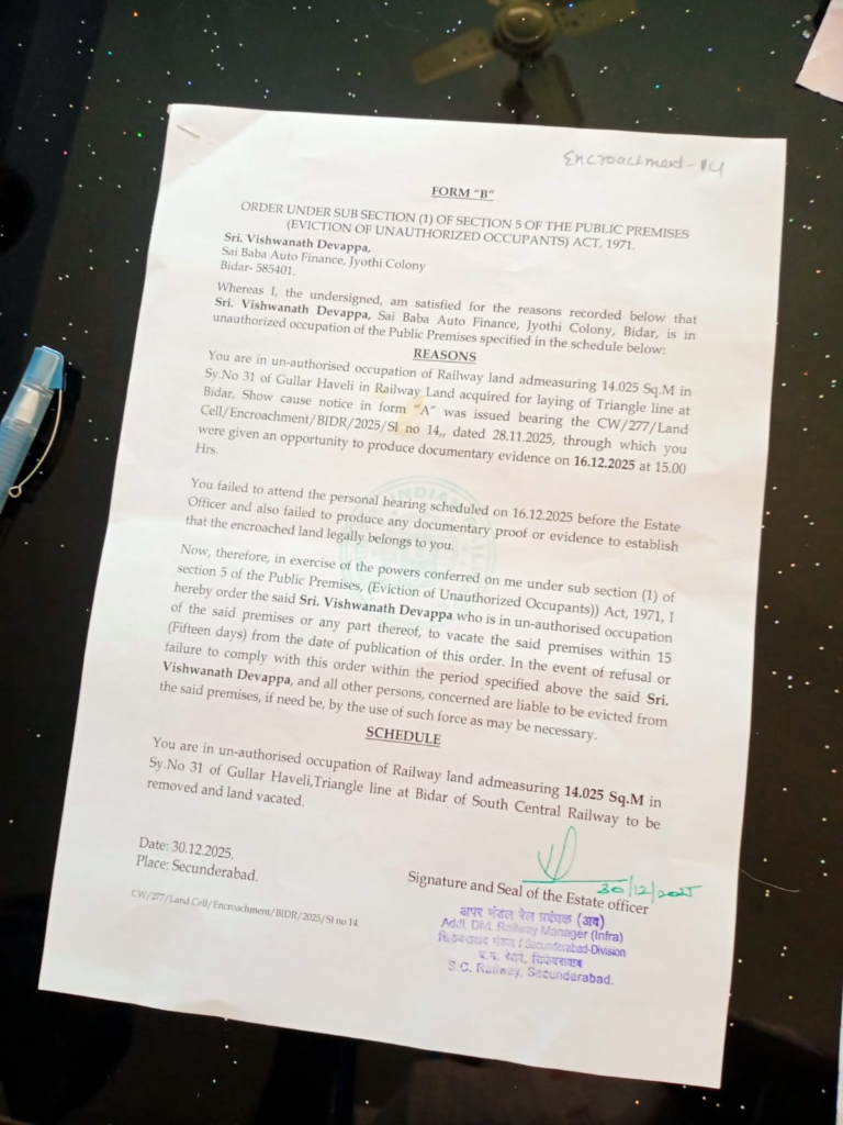 ಕಳೆದ ನವೆಂಬರ್ 28ರಂದೇ ರೈಲ್ವೆ ಇಲಾಖೆಯು (CW/277/Land cell/enchrochment/Bidar/ Sl No. 14) ಮೊದಲ ನೋಟಿಸ್ ನೀಡಿ, ಡಿಸೆಂಬರ್ 16ರ ಒಳಗಾಗಿ ಜಾಗಕ್ಕೆ ಸಂಬಂಧಿಸಿದ ಅಧಿಕೃತ ದಾಖಲೆಗಳನ್ನು ಹಾಜರುಪಡಿಸಲು ಸೂಚಿಸಿತ್ತು. ಆದರೆ, ನಿವಾಸಿಗಳಿಂದ ಸೂಕ್ತ ಸ್ಪಂದನೆ ಅಥವಾ ದಾಖಲೆಗಳು ಲಭ್ಯವಾಗದ ಹಿನ್ನೆಲೆಯಲ್ಲಿ ಇಲಾಖೆ ಈಗ ಕಠಿಣ ಕ್ರಮಕ್ಕೆ ಮುಂದಾಗಿದೆ.