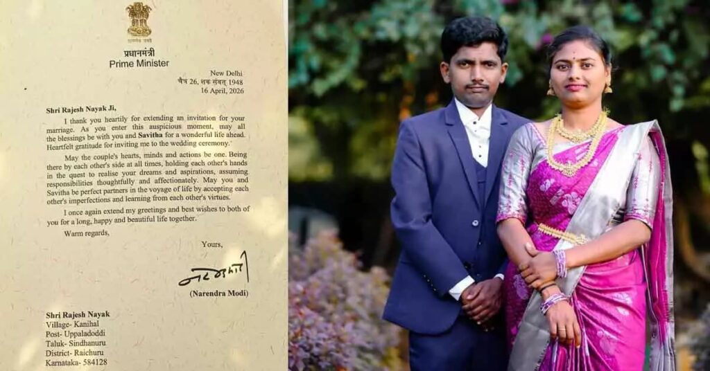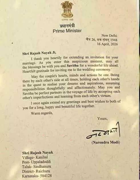 ಯುವಕ ರಾಜೇಶ್, ಏಪ್ರಿಲ್ 13 ರಂದು ಸವಿತಾ ಎಂಬುವವರ ಜೊತೆ ಹಸೆಮಣೆ ಏರಿದ್ದರು. ತಮ್ಮ ಮದುವೆಗೆ ಪ್ರಧಾನಿ ಮೋದಿ ಅವರಿಗೆ ಆಮಂತ್ರಣ ಪತ್ರ ಕಳುಹಿಸಿದ್ದ ರಾಜೇಶ್ಗೆ, ಪ್ರಧಾನಿ ಕಛೇರಿಯಿಂದ (PMO) ಮರು ಉತ್ತರ ಬರಬಹುದು ಎಂಬ ನಿರೀಕ್ಷೆಯಿರಲಿಲ್ಲ. ಆದರೆ, ಪ್ರಧಾನಿಯವರು ನವಜೋಡಿಗೆ ಸುಖ, ಶಾಂತಿ, ನೆಮ್ಮದಿ ಮತ್ತು ಆರೋಗ್ಯಯುತ ಜೀವನ ನಡೆಸಲಿ ಎಂದು ಹಾರೈಸಿ ಕಳುಹಿಸಿದ ಪತ್ರ ಕಂಡು ಕುಟುಂಬಸ್ಥರು ಭಾವುಕರಾಗಿದ್ದಾರೆ.