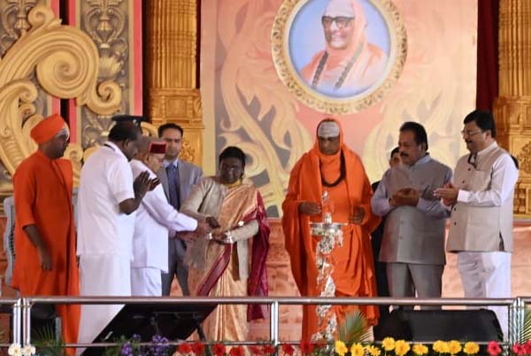 ಕಾರ್ಯಕ್ರಮದಲ್ಲಿ ಭಾಗವಹಿಸಲು ಪಟ್ಟಣದ ಹೊರವಲಯದ ಮಾರೇಹಳ್ಳಿ ಬಳಿ ನಿರ್ಮಿಸಿರುವ ಹೆಲಿಪ್ಯಾಡ್ಗೆ ರಾಷ್ಟ್ರಪತಿ ದ್ರೌಪದಿ ಮುರ್ಮು ಅವರು ಮಧ್ಯಾಹ್ನ 3:20ಕ್ಕೆ ಆಗಮಿಸಿದಾಗ ರಾಜ್ಯಪಾಲ ಥಾವರ್ಚಂದ್ ಗೆಹ್ಲೋಟ್, ಕೇಂದ್ರ ಸಚಿವ ಎಚ್.ಡಿ. ಕುಮಾರಸ್ವಾಮಿ, ಜಿಲ್ಲಾ ಉಸ್ತುವಾರಿ ಸಚಿವ ಎನ್.ಚಲುವರಾಯಸ್ವಾಮಿ ಹೂಗುಚ್ಛ ನೀಡಿ ಆತ್ಮೀಯವಾಗಿ ಸ್ವಾಗತಿಸಿದರು.