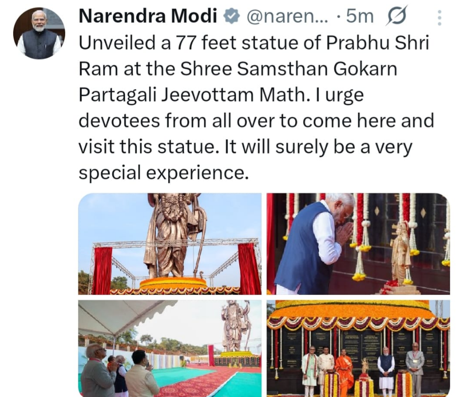 “ಶ್ರೀ ಸಂಸ್ಥಾನ ಗೋಕರ್ಣ ಪರ್ತಗಾಳಿ ಜೀವೋತ್ತಮ ಮಠದಲ್ಲಿ ಪ್ರಭು ಶ್ರೀ ರಾಮನ 77 ಅಡಿ ಎತ್ತರದ ಭವ್ಯ ಪ್ರತಿಮೆಯನ್ನು ಅನಾವರಣಗೊಳಿಸಲಾಯಿತು. ಎಲ್ಲೆಡೆಯಿಂದ ಭಕ್ತರು ಈ ಐತಿಹಾಸಿಕ ಮತ್ತು ದಿವ್ಯ ಪ್ರತಿಮೆಯನ್ನು ಸಂದರ್ಶಿಸಿ, ಅದರ ಸೌಂದರ್ಯವನ್ನು ಕಣ್ತುಂಬಿಕೊಳ್ಳಬೇಕೆಂದು ನಾನು ಈ ಸಂದರ್ಭದಲ್ಲಿ ಒತ್ತಾಯಿಸುತ್ತೇನೆ. ಇದು ಖಂಡಿತವಾಗಿಯೂ ಪ್ರತಿಯೊಬ್ಬರಿಗೂ ಒಂದು ಬಹಳ ವಿಶೇಷ ಅನುಭವವನ್ನು ನೀಡುತ್ತದೆ,” ಎಂದು ಪ್ರಧಾನಿ ಮೋದಿ ಅವರು ಮನವಿ ಮಾಡಿದ್ದಾರೆ.