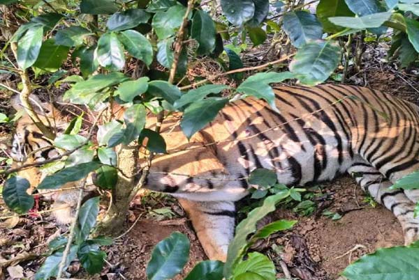 ಕಾಡು ಹಂದಿ ಸೆರೆಗೆ ಹಾಕಲಾಗಿದ್ದ ಉರುಳು ರಾಷ್ಟ್ರ ಮೃಗದ ಪ್ರಾಣಕ್ಕೆ ಉರುಳಾಗಿದೆ. ರಾಷ್ಟ್ರ ಮೃಗ ದಾರುಣವಾಗಿ ಸಾವನ್ನಪ್ಪಿದೆ. ಕಾಡಲ್ಲಿ ಜಿಂಕೆ ಬೇಟೆ ಮಾಡಿ ಹೊಟ್ಟೆ ತುಂಬಾ ತಿಂದು ಮತ್ತೊಂದು ಕಾಡಿನತ್ತ ಹುಲಿ ಹೊರಟಿತ್ತು. ಆದರೆ ದುಷ್ಕರ್ಮಿಗಳು ಹಾಕಿದ ಉರುಳಿಗೆ ಹುಲಿ ಅನ್ಯಾಯವಾಗಿ ಪ್ರಾಣ ಬಿಟ್ಟಿದೆ. ಕುಶಾಲನಗರ ತಾಲ್ಲೂಕಿನ ಚೆಟ್ಟಳ್ಳಿ ಸಮೀಪದ ಶ್ರೀಮಂಗಲ ಗ್ರಾಮದಲ್ಲಿ ಮಂಗಳವಾರ ಎಸ್ಟೇಟ್ ರಸ್ತೆ ಬದಿಯಲ್ಲಿ ಹುಲಿ ಹೆಣವಾಗಿ ಪತ್ತೆಯಾಗಿದೆ.